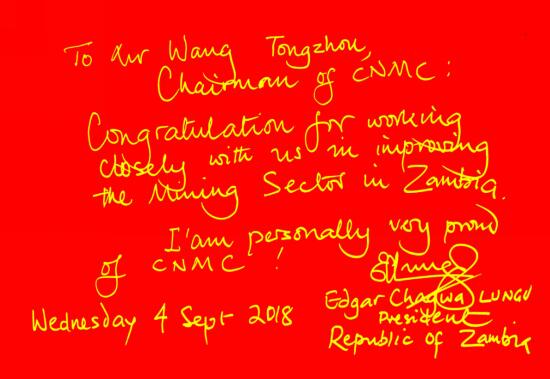 為表達對論壇成功舉行的祝賀,9月4日,倫古總統(tǒng)閣下親筆題寫致中國有色集團董事長王彤宙的賀信,信中寫道:“祝賀中國有色集團和贊比亞緊密合作,共同促進贊比亞的礦業(yè)發(fā)展,我為中國有色集團感到自豪”。