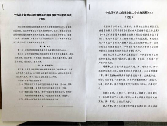 中色國礦建章立制加強疫情防控工作 中色國礦編撰了《新型冠狀病毒感染的肺炎預(yù)防控制管理辦法》和《疫情防控工作實施流程》等相關(guān)制度辦法,為節(jié)后上班疫情防控提前做好安排。面對疫情可能對生產(chǎn)經(jīng)營可能產(chǎn)生的影響,制定了工作預(yù)案,提前做好境外物資采購渠道備份溝通。積極響應(yīng)集團(tuán)公司倡議,迅速組織員工捐款捐物,為疫情防控貢獻(xiàn)力量。